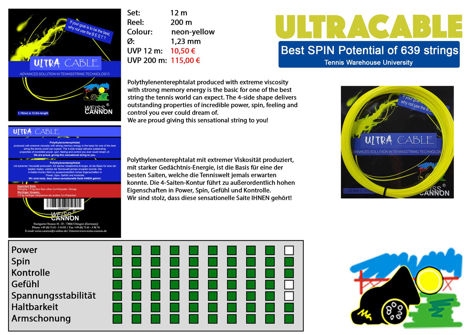 Povsem nova teniška struna Weiss Cannon Ultra Cable predstavlja izredno kvalitetno, ostro 4 stransko struno, ki nudi izjemno rotacijo (spin).