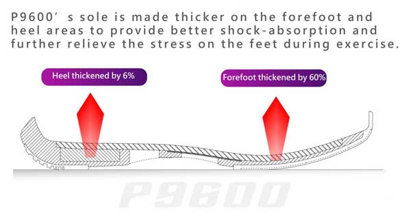 Pri modelu P9600 so povečali debelino podplata tako v sprednjem kot tudi zadnjem delu copata. Tako so dodatno izboljšali blaženje pri doskoku in tako zmanjšali utrujenost vaših nog.