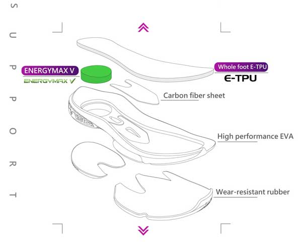 E-TPU se uporablja po celotni dolžini stopala, njegova zmogljivost odboja in dobrega stiskanja pa se popolnoma ujema z ENERGYMAX V tehnologijo v peti, kar zagotavlja elastično, udobno in blažilno izkušnjo. Peta je bolj ukrivljena in debelejša, da ne daje le poenostavljen videz, ampak tudi, kar je še pomembneje, omogoča boljši prehod energije od pristanka do odriva.